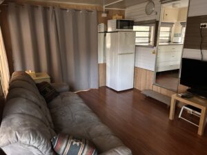 Caravan & annexe with driveway/car park right next to the annex. Scenic outlook facing no neighbours! Outdoor deck and bench/worktop with GasMate BBQ Driveway is half grass turf, with parking space Fire pit Steps away from the riverfront & close to amenity block Spacious annex with ample space to add further bed/bunks Lounge with 40’inch TV Tall cupboard & drawer storage Near new Oak extendable dining table with rattan chairs Dyson vacuum Lamps, rugs, cushions & plants as pictured Split system heating and cooling Renovated kitchen with running cold water, two counter tops & LED strip lighting, microwave, portable bench top oven/airfyer, coffee machine, kettle, toaster and fridge/ freezer & crockery Separate sleeping area with 2 x new single beds (frames and near new mattresses) – (with f lexibility to join together or separate) Additional portable stretcher bed with 2 x mattresses Outdoor camping table, 2 x outdoor Oztrail camping chairs (perfect for around the fire pit)