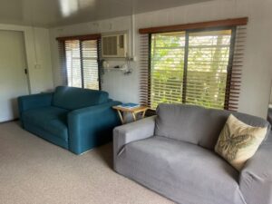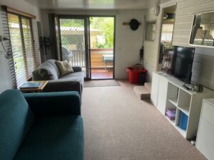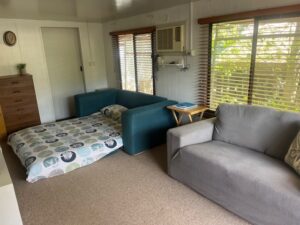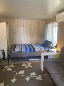 Spacious annex with Koala Queen fold-out Sofa bed, couch, ample storage, Wall Air Conditioner/Heater, wall mounted stick vacuum, and Flat Screen TV.