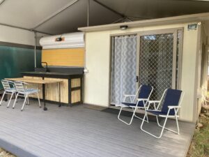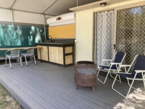 Cold water running water and sink/bench located on the deck.