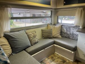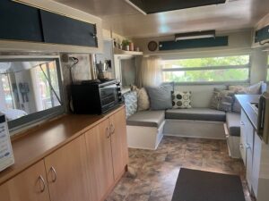 Cold water running water inside the van, microwave, 1 small fridge/freezer, large fridge freezer, table and chairs, split system heating and cooling and storage shelves and cupboards. New double mattress and new QB frame & mattress.