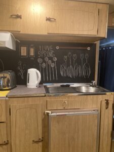 Kitchen with running cold & hot water, two counter tops, full size double sink, microwave, portable bench top oven, kettle, toaster, fridge/freezer & crockery.